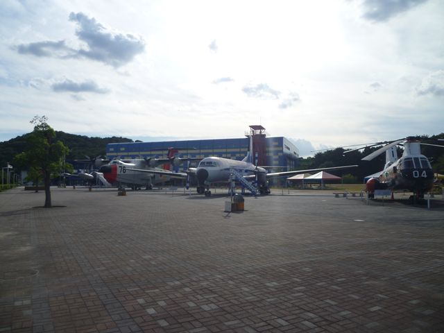 ぱっと見えるものだと右端がV-107、真中が国産旅客機YS-11、奥が飛行艇US-1、あとほとんど見えないと思いますがその向こうに対潜哨戒機P-2Jがあります。